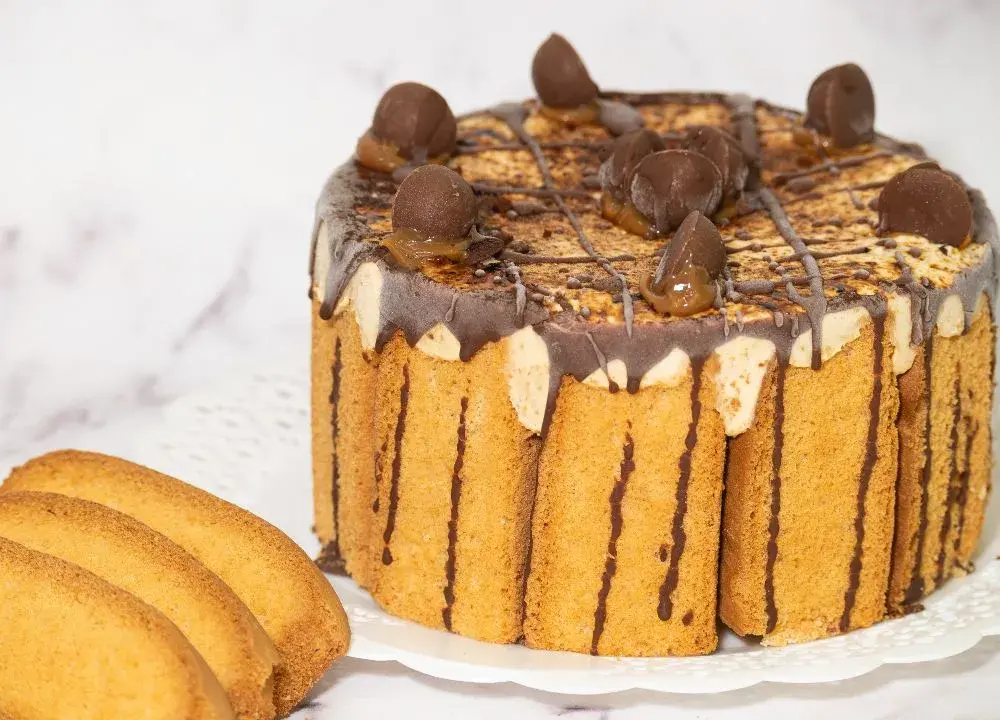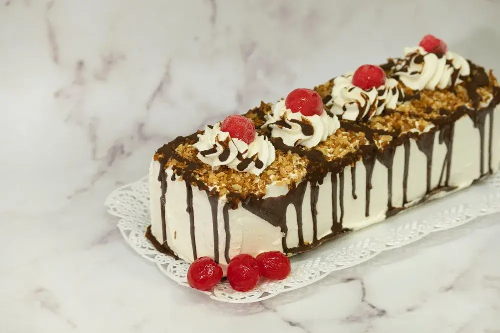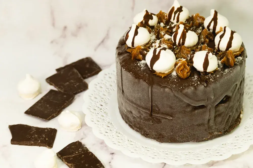 Decorado con merengues, dulce de leche natural y salsa de chocolate.