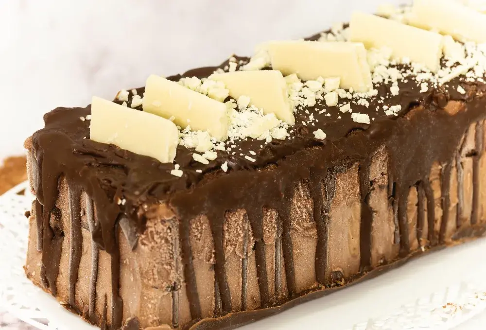 Decorado con trozos de chocolate semiamargo y salsa de chocolate.
